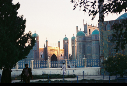 Sunset arrival in Mazar i Sharif, the 15th century the blue tiled mosque of Husayn Bayqara.