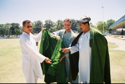 Last. Abdul Qadir Dostum gives me his bloodied chapan-riding jacket which he wore during 2005 Al Queda suicide bombing attemp on life of General Dostum.