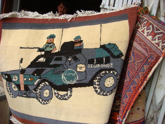 Afghan carpet depicting International Security and Assistance Force (ISAF) armored personel carrier.