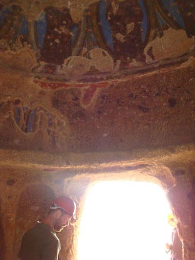 Remnants of the ancient stucco paint still visible on the walls of caves behind the Buddhas.