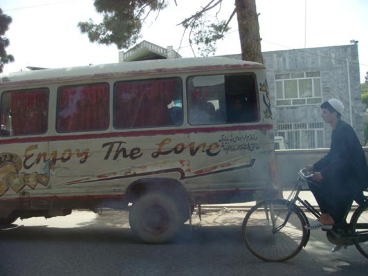 Wonderful Afghan juxtapositions or admixtures. A bus in Herat with a slogan from the days when hippies visited Afghanistan.