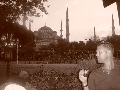 Enjoying tea in outdoor cafe in front of 17th century Blue Mosque, Istanbul