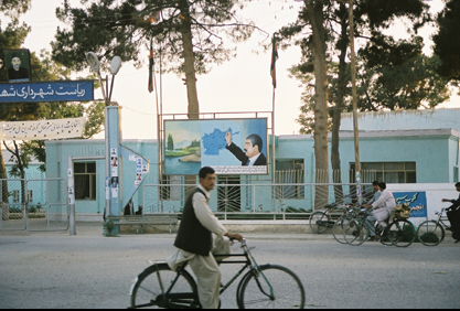 Arrival in Sheberghan, Dostum's headquarters, billboard