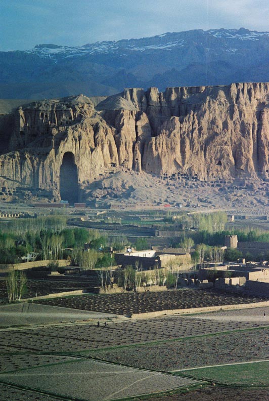 Sunrise over the valley of Bamiyan. In the distance the empty niche where the largest Buddha statue once stood.
