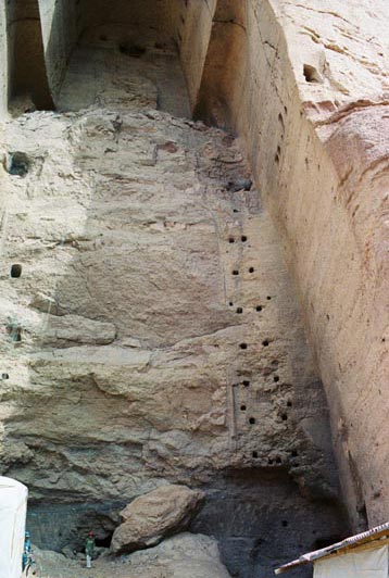 Feyza (at bottom with red hat) stands in the now-empty niche where the largest Buddha stood for 1,500 years.
