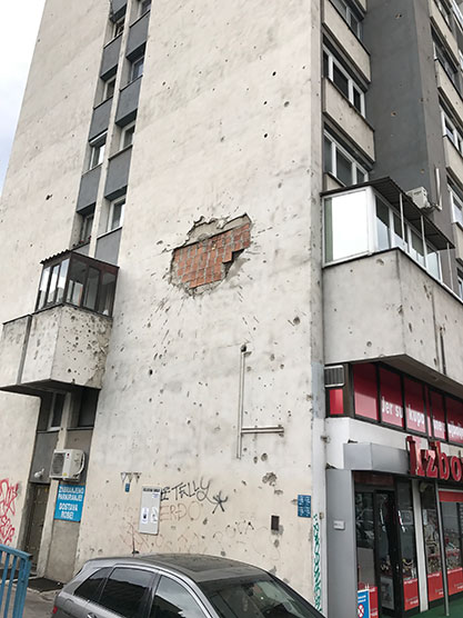 Typical example of a patched up hole in a building caused by Serbian artillery strike during the Bosnian War and the Siege of Sarajevo