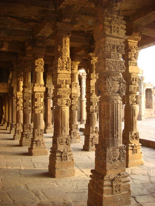 Evening sun highlights intricate architectural details that have lasted 800 years, Qutb complex. Delhi.
