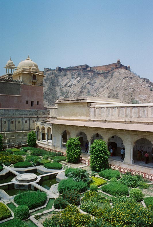 The Amber Fort outside Jaipur (Rajahstan). Built in 1592 looks it like a military complex on the outside but contains beatiful temples, gardens and palaces on the inside.