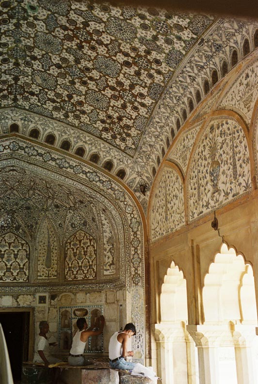 Workers restoring the ceiling to the Raj’s private chambers, Amber Fortress, Jaipur.