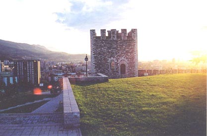 View of Skopje, Macedonia, with wall of Ottoman fortress in foreground.