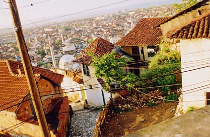 View of the red-tiled roofs and minarets of Prizren, Kosovo. A showcase of Muslim Balkan architecture.